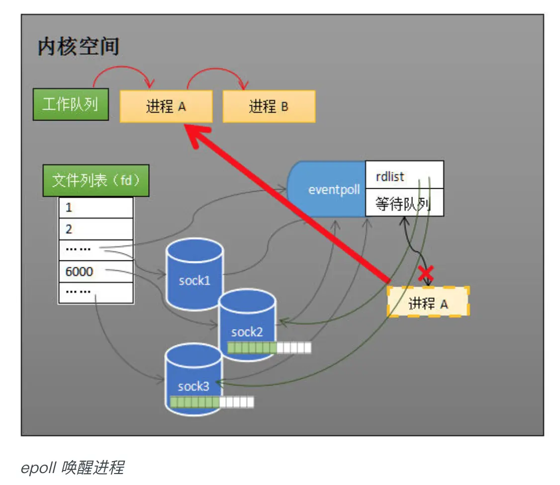 当 socket 接收到数据,中断程序一方面修改 rdlist,另一方面唤醒 eventpoll 等待队列中的进程,进程 A 再次进入运行状态(如下图)。也因为 rdlist 的存在,进程 A 可以知道哪些 socket 发生了变化。