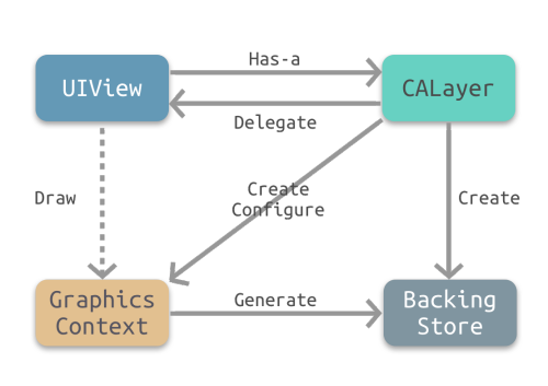 UIView有一个关联图层,即CALayer。CALayer有一个可选的delegate属性,实现了CALayerDelegate协议。UIView作为CALayer的代理实现了CALayerDelegae协议。- 当需要重绘时,即调用