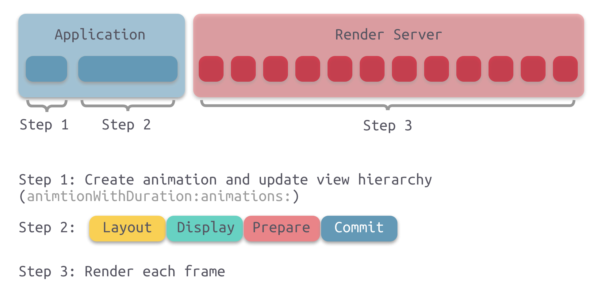 日常开发中,如果不是特别复杂的动画,一般使用 UIView Animation 实现,iOS 将其处理过程分为如下三部阶段: