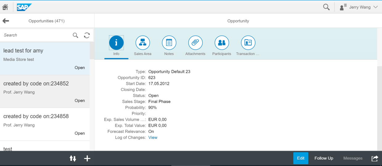 上述场景里SAP Gateway系统为GM4,后台为AG3. 此时回到Fiori UI,能看到AG3后台的Opportunity数据成功被取回来了。