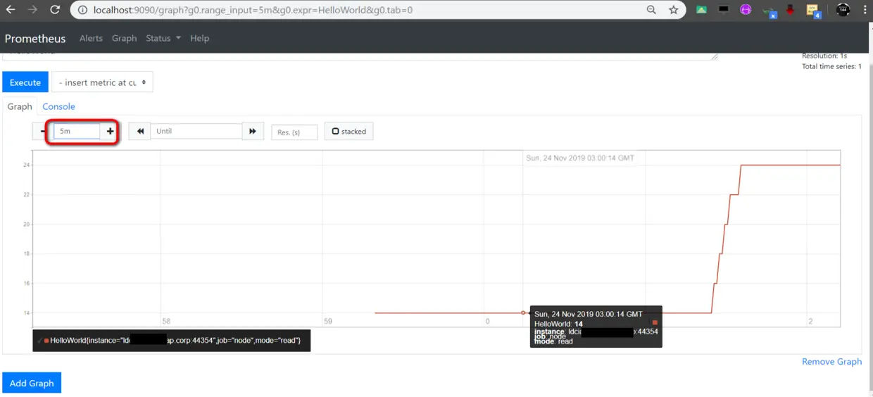 切换到Graph面板,能看到指定时间间隔内的读请求变化趋势,比如下图的横轴是时间点,纵轴是读请求个数,图上的折线表达了过去五分钟之内,读请求数量呈线性增长的趋势。