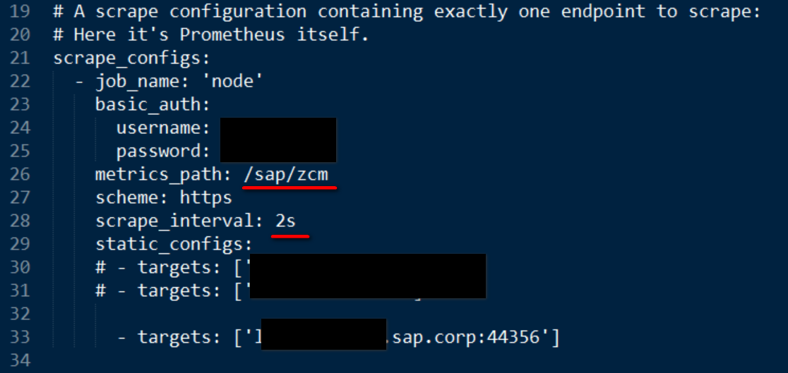 第26行metrics_path即为SICF事务码里创建的服务路径,28行意思是每2秒抓取一次。33行是Netweaver服务器的主机名。