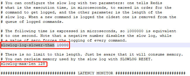 Redis提供了预设阀值:slowlog-log-slower-than,单位是微秒,默认10000微秒,执行一条很慢的命令(例如keys *),执行时间超过了10000微秒,则这条命令会被记录在慢查询日志中。