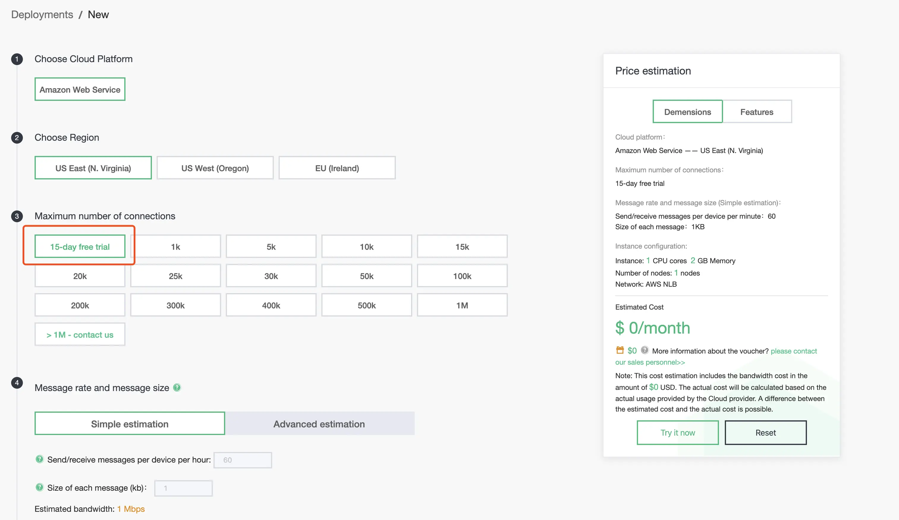 - 注册后点击 EMQX Cloud 申请免费试用15天部署