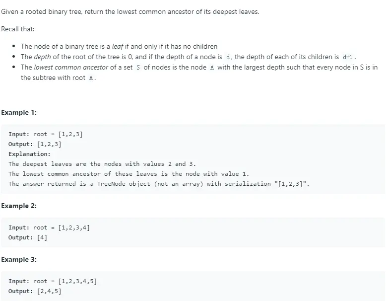 定义一个函数,用来返回当前节点的深度,如果左子树和右子树深度一样,则返回根节点,如果左子树深度比右子树深度深,则返回左子树中的最深叶节点的最小公共父节点;如果是右子树比较深,则返回右子树中最深叶节点的最小公共父节点。