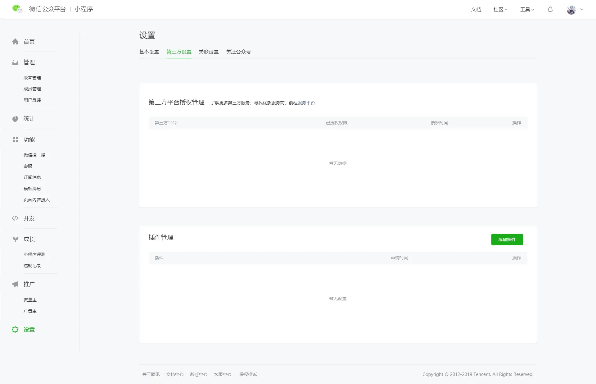 在小程序后台 设置》第三方设置》插件管理 点击添加插件按钮