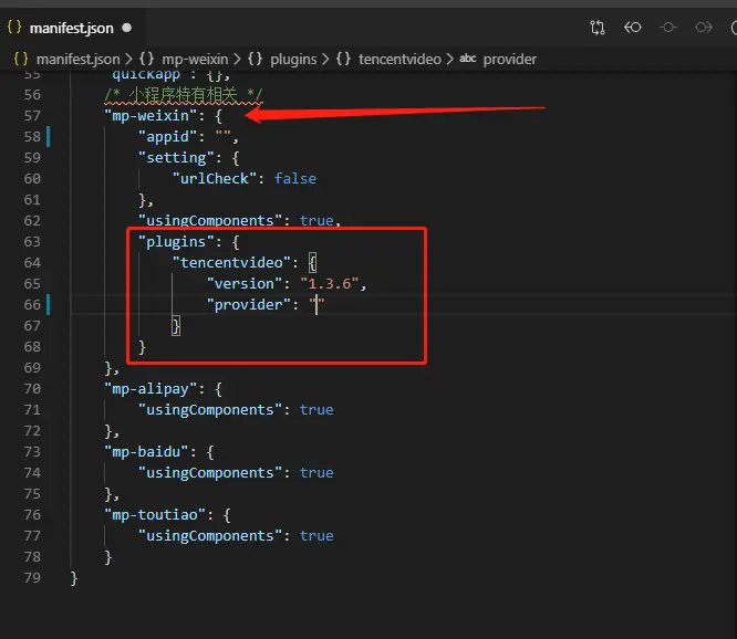 经过上面的步骤,我们已经可以在原生小程序开发框架下使用腾讯视频插件了。接下来讲讲腾讯视频插件在uniapp中的使用方法。 首先找到在项目根目录的 manifest.json 文件,在 mp-weixin 中加入