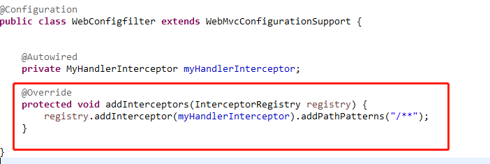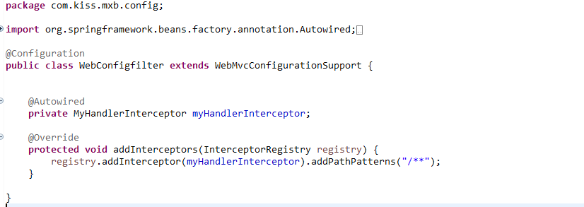 现在spring-ioc 容器中已经存在我自己创建的拦截器,但是还要把它WebMvcConfigurationSupport(后面会讲为啥要交给它管理)