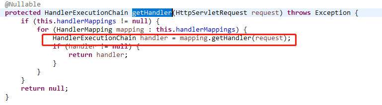 - DispatcherServlet.getHandler(HttpServletRequest)代码如下: