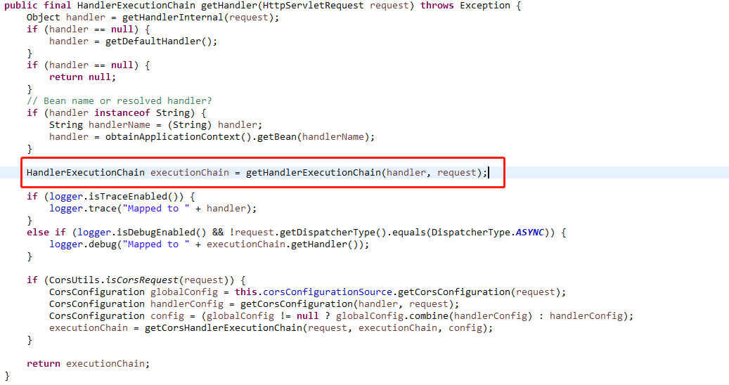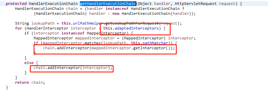 - HandlerExecutionChain 是在 org.springframework.web.servlet.DispatcherServlet.getHandler(HttpServletRequest)中返回的,说明HandlerExecutionChain.interceptors也是在这个时候别赋值的.