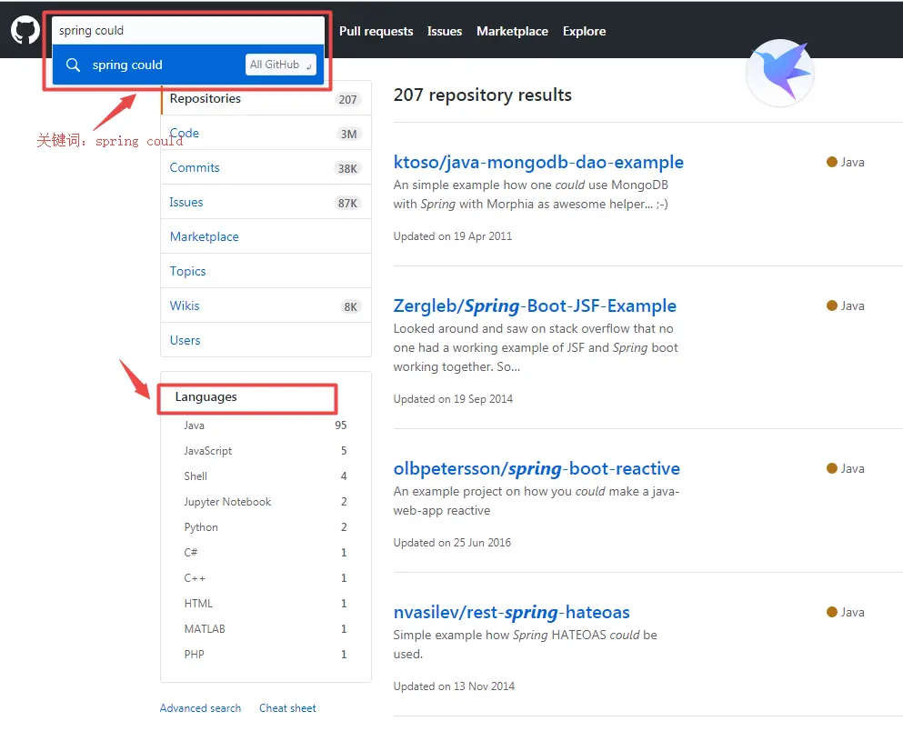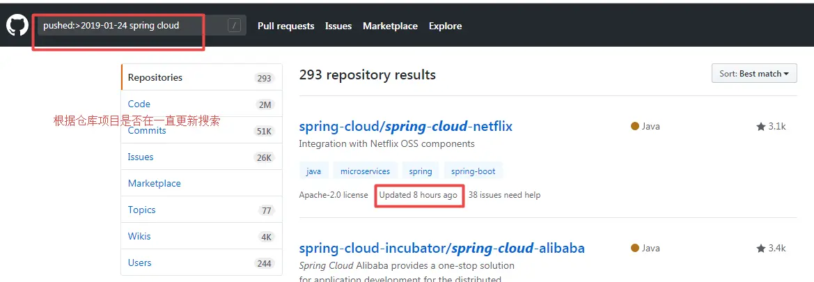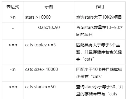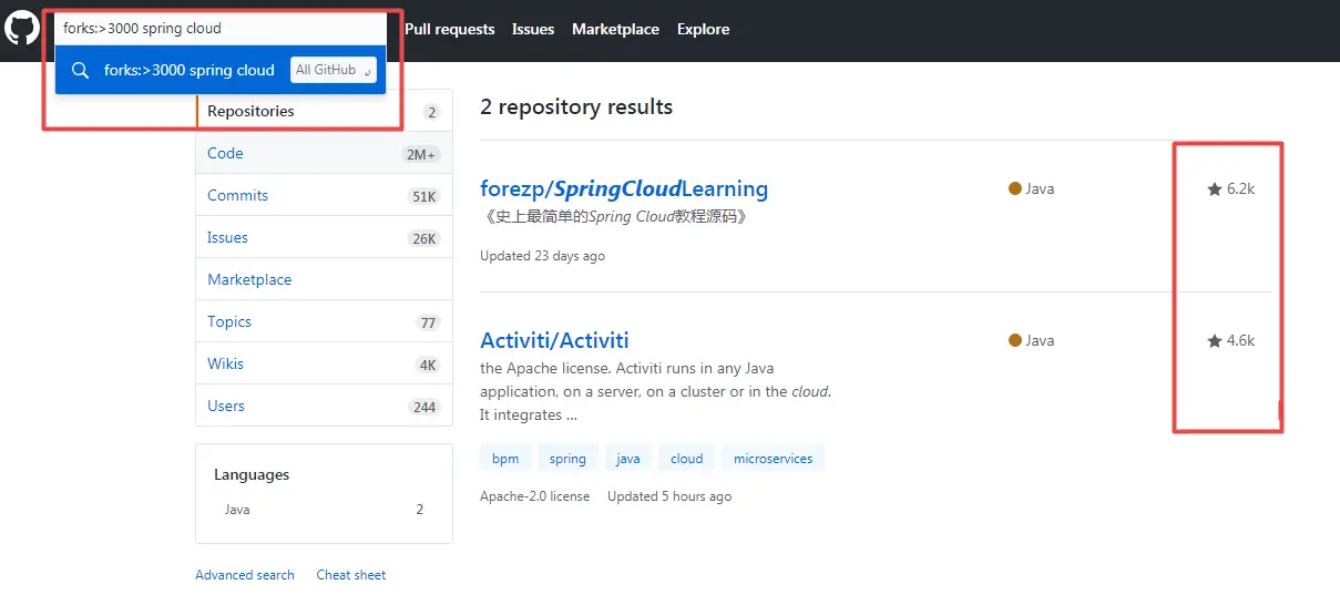 ① stars:> 数字 关键词【例如:stars:>3000 spring cloud】