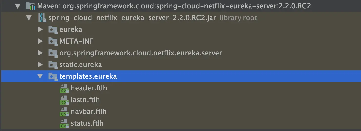 在spring-cloud-netflix-eureka-server-xx.xx.xx.jar依赖文件内我们可以找到tempaltes.eureka目录,结构如下图所示: