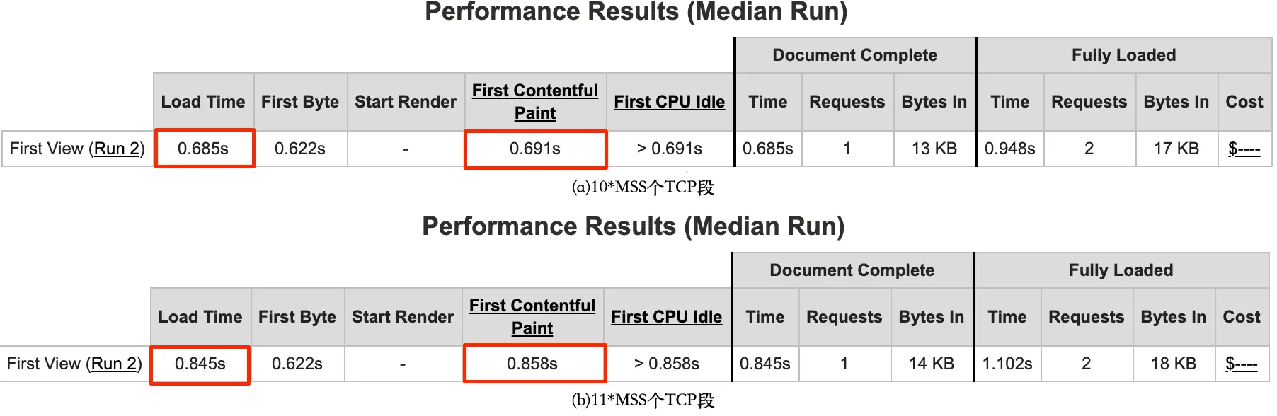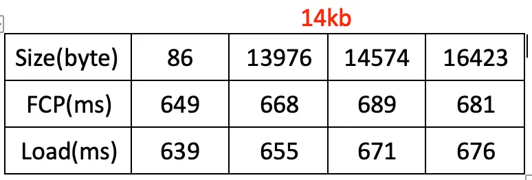 前面提到资源超过 14kb 会多次往返,延长了传输时间,为了探究 html 刚好超过 14kb 时(多一次往返)对网页性能的影响,进行了如下测试: