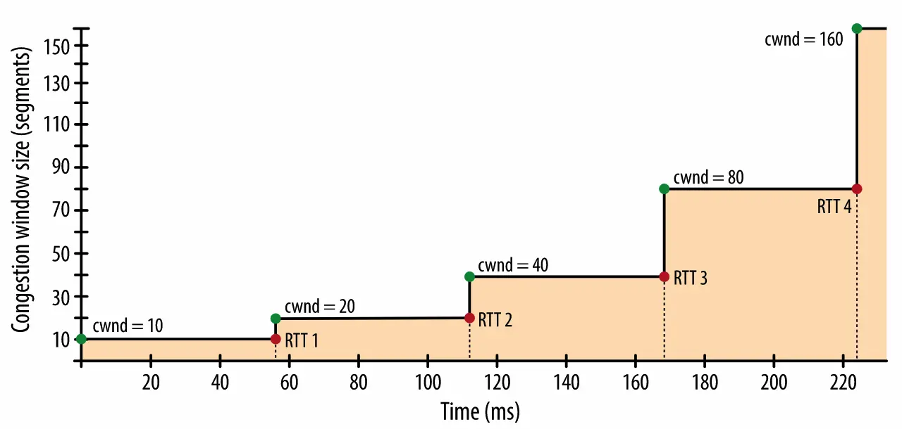 服务器向客户端发送完 10 个 TCP 段后,必须停下来等待确认,此后,每当收到一个 ACK,慢启动算法就会告诉服务器可以将它的 cwnd 增加一个 TCP 段(一次发送 10 个 TCP 段,相当于增加 10 个 TCP 段)。