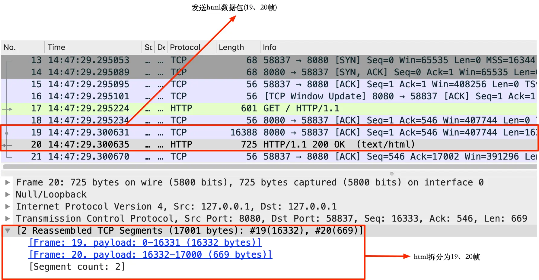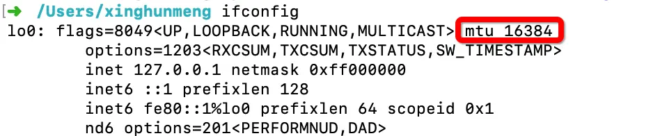 可以看到,mac 上我测试用的 lo0(回环网卡)的 mtu 为 16384,减去 ip 首部 20 和 tcp 首部 20,MSS 为 16344,也就是说 14574 字节的 html 并没有达到被拆包的大小阈值,没有对网页性能造成影响就说得过去,不慌了,不慌了。于是将 html 的大小增大至 16705(大于 16344),再进行测试,结果仍未有太大影响,加载时间仍在 650-660 之间徘徊,黑人问号脸,再抓包看看: