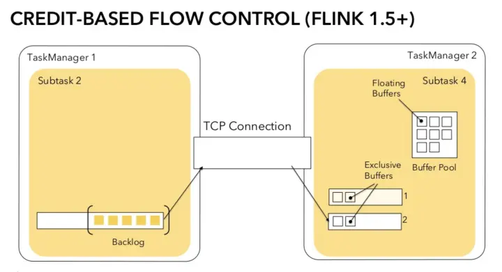 在接收端,每个 Channel 在初始阶段会被分配固定数量的 Exclusive Buffer,这些 Buffer 会被用于存储接受到的数据,交给 Operator 使用后再次被释放。Channel 接收端空闲的 Buffer 数量称为 Credit,Credit 会被定时同步给发送端被后者用于决定发送多少个 Buffer 的数据。