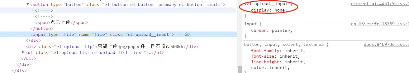 - 最后检查el组件实际上是对input type=“file”做了封装,默认input显示display:none,大概是点击文案button去借调了input的file方法,具体为何照成的底层原理小弟还不太清楚。