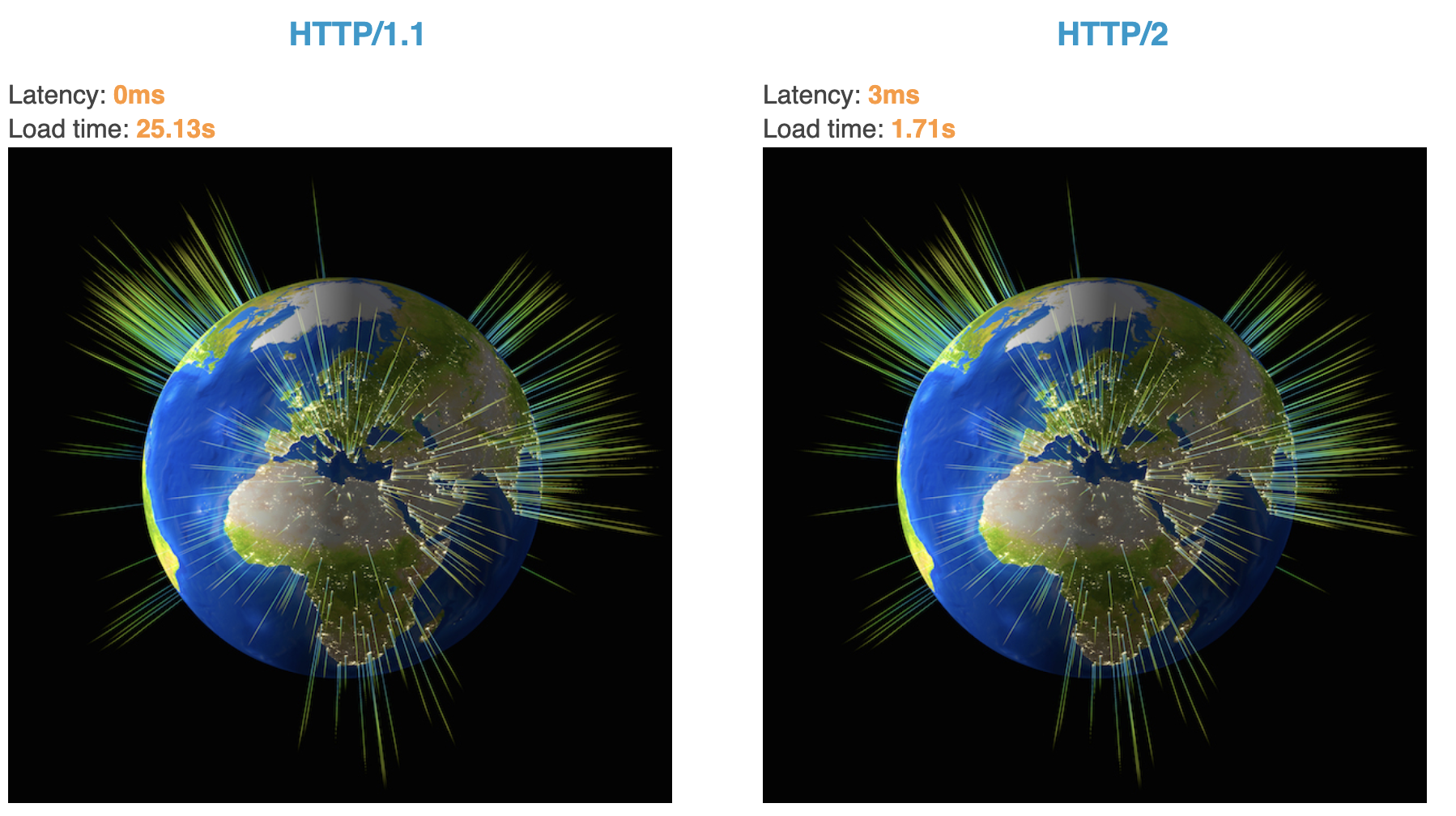 HTTP/2继承于Google的SPDY协议。HTTP/2: the Future of the Internet | Akamai这是Akamai公司用来说明HTTP/2的优势所创建的demo。同时请求379张图片,HTTP/2速度占了绝对的优势。