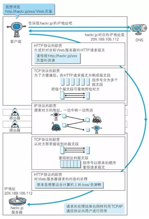 - 域名解析。如用浏览器访问http://hackr.jp/xss/web页面,需要域名系统DNS解析域名hackr.jp,得主机的IP地址 20X.189.105.112,接着结合本机信息封装成HTTP请求数据包。