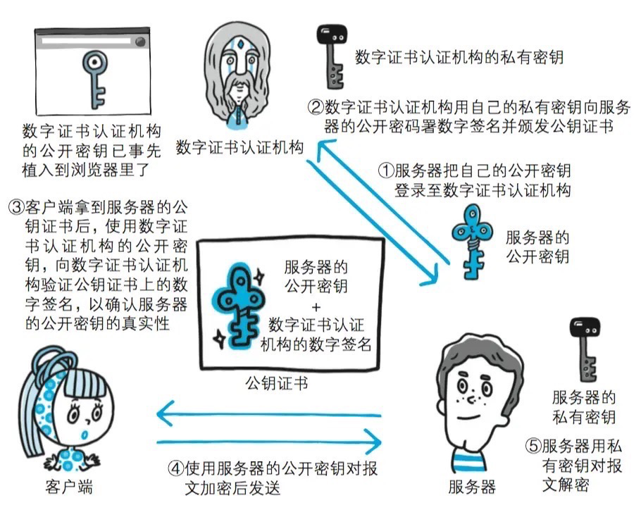 - 解决方案:数字证书 为了防止中间人攻击,掉包公钥,我们需要一个第三方权威机构来管理,让第三方机构用其私钥加密生成数字签名,当接受到身份信息和公钥后再用第三方机构的公钥进行解密来比对信息摘要,这个第三方机构就是CA(Certification Authority)。向CA提交公钥、组织信息、个人信息等信息并申请认证,认证通过后CA会向申请者颁发CA证书,证书内包含:申请者公钥、申请者的组织信息和个人信息、签发机构、CA的信息、有效时间、证书序列号等信息的明文,同时包含一个数字签名。 CA自身的数字证书在我们操作系统刚安装好的时候,这些CA自身的数字证书就已经被微软(或者其它操作系统)安装在操作系统中了。而CA的公钥就包含在其中。这样,CA就可以通过自身的私钥对发布的数字证书进行签名,而在客户端就能够用对应的公钥来对其进行解密,确保了双方能安全传输服务器公钥。