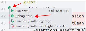 在上述标注1、2、3的代码处打上断点,点击@Test左边的绿色按钮,选择Debug进行调试。