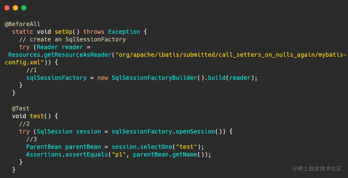 @BeforeAll 注解用于表示在当前测试类的所有测试方法之前执行注解该注解标注的方法,第一段代码将在执行@Test注解的方法之前设置 sqlSessionFactory。