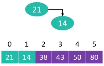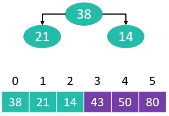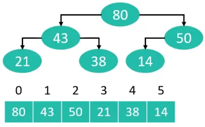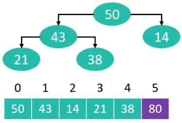 建完堆之后,就可以利用堆,直接获取堆中的最大值,从上图来讲的话,就是直接将0号位置与5号位置的元素进行交换就好了,这样就确定好了一个最大值,接下来将堆的size减1,这样就将已经排好序的元素排除在外。然后再修复最大堆的性质,将0号位置的元素执行siftDown操作。siftDown完成后的结果为