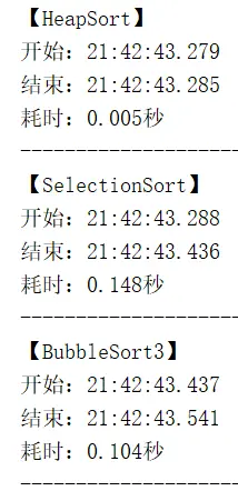 通过这种方式实现以后,可以结合前面介绍的两种排序算法,进行一个比较。从消耗的时间来看,对10000个元素进行排序,得到的结果是