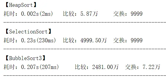 从这里的结果,可以看到,堆排序的性能是高于选择排序与冒泡排序的。不过,有时候只看消耗的时间还不是完全准确,所以现在也可以从元素的比较次数,交换次数来进行对比,我通过封装以后,同样对10000个元素进行排序,得到三种不同排序算法的最终结果为