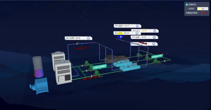 var waterPump5 = dm.getDataByTag('水泵05');waterPump6.s({ 'note': '点我切换模型', 'note.transparent': true, 'note.t3': [0, 0, -50], 'note.reverse.flip': true});g3d.mi(function(e) { if(e.kind === 'clickData') { // 模型点击切换 if (e.data === waterPump6 && e.data.s('shape3d') === 'models/裙房系统/水泵.json') e.data.s('shape3d', 'models/fengji.json'); else if (e.data === waterPump6 && e.data.s('shape3d') === 'models/fengji.json') e.data.s('shape3d', 'models/裙房系统/水泵.json'); // 模型点击 隐藏/显示属性窗口 if (e.data === waterPump5) {// 判断点击的图元是否为 waterPump5 if(giveWater.s('3d.visible')) {// 判断当前属性窗口是否为显示状态 giveWater.s('3d.visible', false);// 设置属性窗口不可见 e.data.s('note', '点我显示属性窗口');// 更改标注中的显示内容 } else { giveWater.s('3d.visible', true);// 设置属性窗口可见 e.data.s('note', '点我隐藏属性窗口')// 更改标注中的显示内容 } } }});文本内容/颜色变换