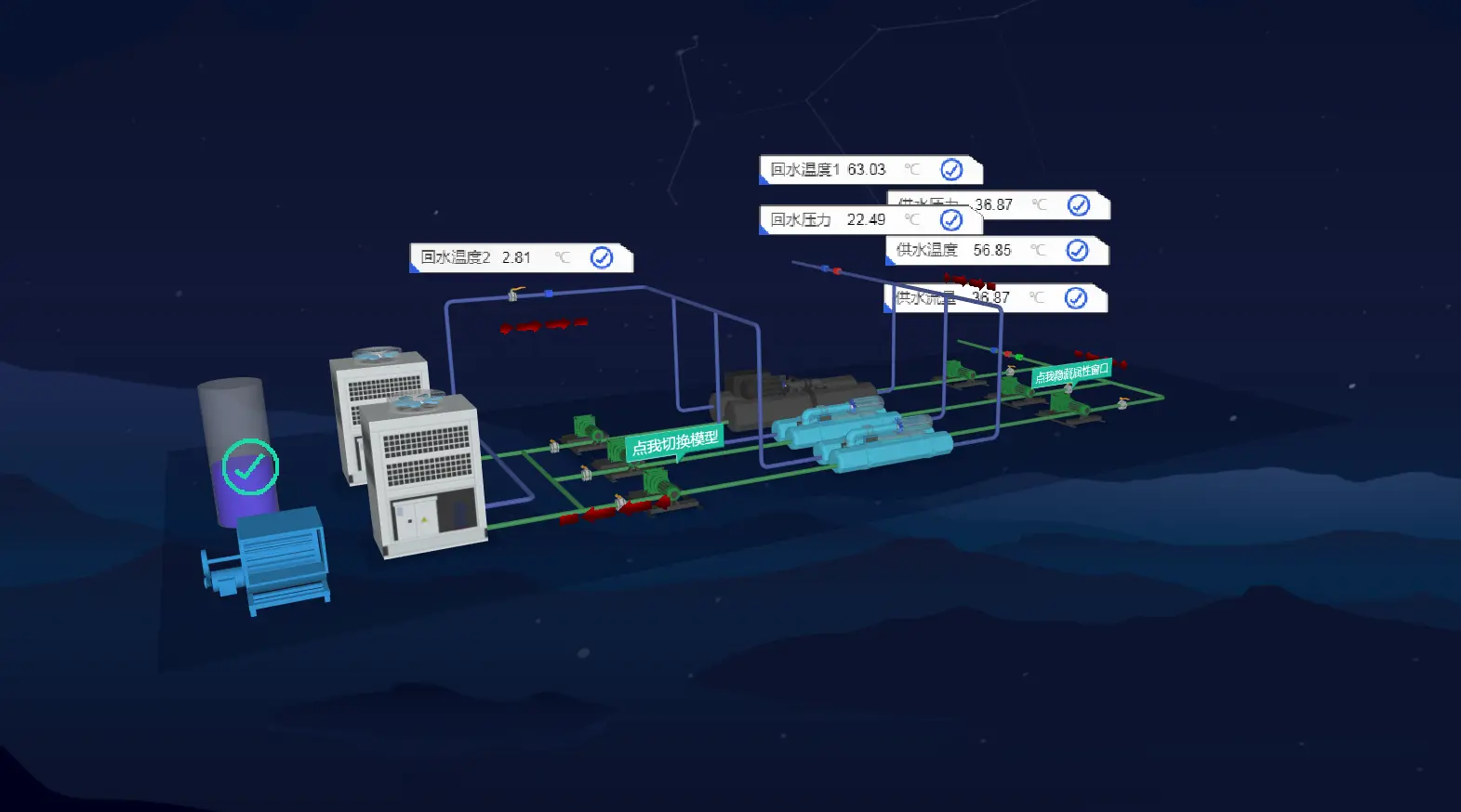 var waterPump6 = dm.getDataByTag('水泵06');// 获取 tag 为“水泵06”的节点waterPump6.s({// 设置该节点的样式属性 'note': '点我切换模型',// 设置标注文字内容 'note.transparent': true,// 设置标注在 3D 下是否透明 'note.t3': [0, 0, -50],// 设置标注在 3D 下的偏移 'note.reverse.flip': true//设置标注背面是否显示正面的内容});g3d.mi(function(e) {// 监听 3D 组件上的事件 if(e.kind === 'clickData') {// 点击节点事件 // 模型点击切换 if (e.data === waterPump6 && e.data.s('shape3d') === 'models/裙房系统/水泵.json') e.data.s('shape3d', 'models/fengji.json');// 设置点击节点的 shape3d 样式属性 else if (e.data === waterPump6 && e.data.s('shape3d') === 'models/fengji.json') e.data.s('shape3d', 'models/裙房系统/水泵.json');// 设置点击节点的 shape3d 样式属性 }});HT 设置模型是通过设置节点的样式属性 node.setStyle(简写为 node.s)为 shape3d 来实现的。