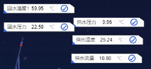 var billboardArray = [];// 通过 tag 获取节点var temperature1 = dm.getDataByTag('回水温度1');// 获取 tag 为"回水温度1"的节点billboardArray.push(temperature1);var temperature2 = dm.getDataByTag('回水温度2');billboardArray.push(temperature2);var returnPress = dm.getDataByTag('回水压力');billboardArray.push(returnPress);var givePress = dm.getDataByTag('供水压力');billboardArray.push(givePress);var giveTemp = dm.getDataByTag('供水温度');billboardArray.push(giveTemp);var giveWater = dm.getDataByTag('供水流量');billboardArray.push(giveWater);// 文字标签内容变换billboardArray.forEach(function(billboard) { billboard.a('label', billboard.getTag());// 设置数据绑定属性为 label 的属性值为当前节点的 tag 内容});// 文字标签数字变换+颜色变换 更改图标中绑定的 value 属性值setInterval(function() { billboardArray.forEach(function(billboard) { var random = Math.random()*100; billboard.a('value', random.toFixed(2)); // 设置图标中“数值内容颜色” if (random > 70 && random <= 80) billboard.a('valueColor', '#00FFFF'); else if (random > 80 && random <= 90) billboard.a('valueColor', '#FFA000'); else if (random > 90) billboard.a('valueColor', '#FF0000'); else billboard.a('valueColor', ''); });}, 1000);