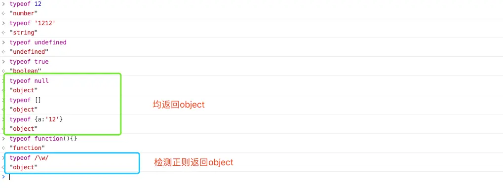 但是typeof用于检测基本数据类型很有效。 但引用类型就不行了,因为typeof检测object、null、数组都会返回object。