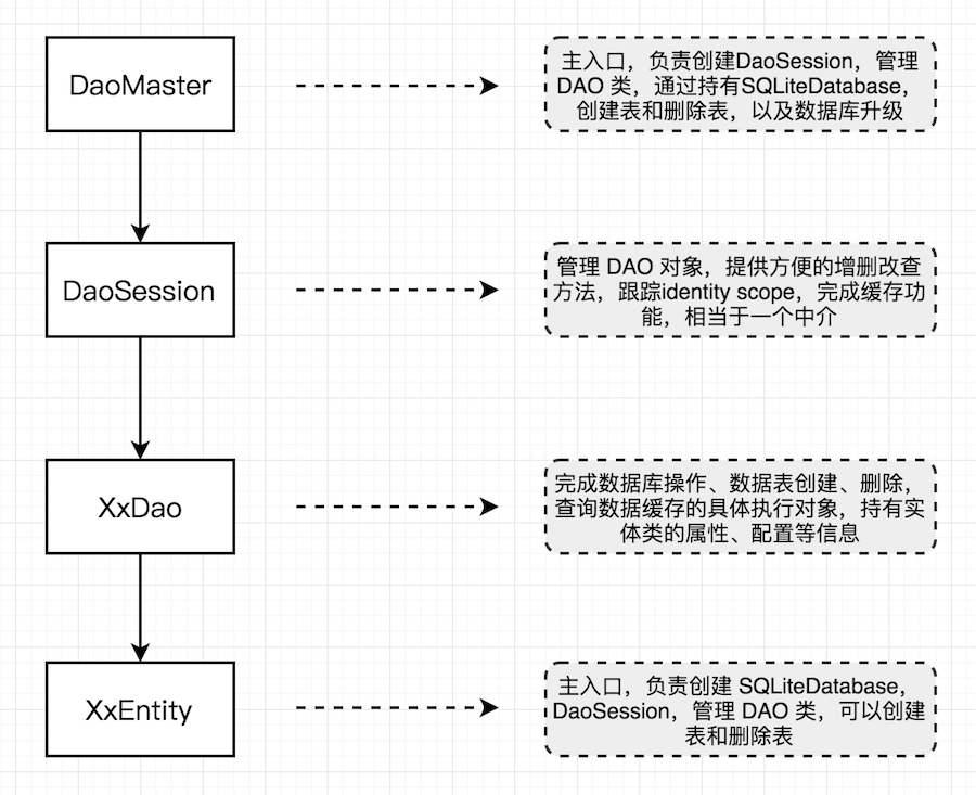 理解了 DaoMaster、DaoSession、xxDAO 这个几个类, greenDAO 也就基本理解了,这里给出一个比喻,DaoMaster 相当于一个 Boss,统领大局,但是具体的工作会交给 DaoSession, DaoSession 相当于一个 Leader,会负责管理一些 xxDAO,当然也可以有多个 DaoSession,DaoSession 会提供数据库操作的一些方便的入口方法,其内部具体的执行会交给 xxDAO 执行,xxDAO 负责自己对应的实体类对象的增删改查,其中执行过程中需要 DaoConfig 和 DatabaseStatement,拿到拼接的 sql 语句和要存储的实体类的参数值,最终会通过原生数据库完成操作,基本就是这样一个过程,可以理解为职责一步步向下传递的过程。