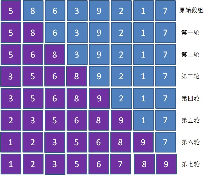 以此类推,插入排序一共会进行(数组长度-1)轮,每一轮的结果如下: