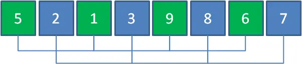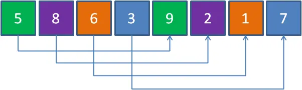 所谓分组,就是让元素两两一组,同组两个元素之间的跨度,都是数组总长度的一半,也就是跨度为4。