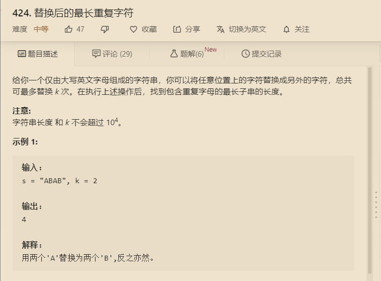 - 滑动过程中,得到该窗口内的字符数量最多的值max, 如果窗口长度length - max 小于给定的替换长度k, 那么此时满足条件,可以继续拉大滑动窗口,右窗口往前走。反之,左窗口往前走,即缩小窗口。