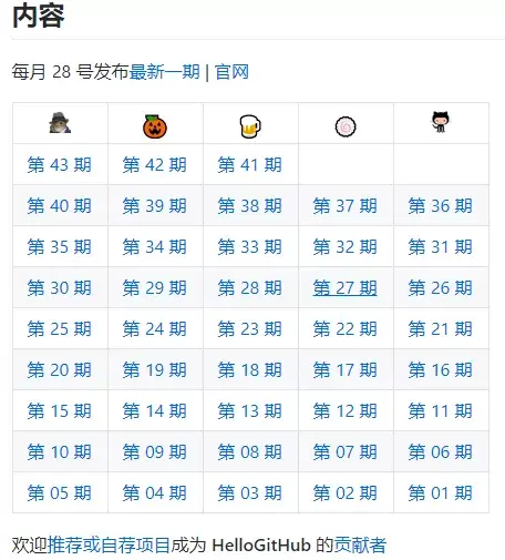 在项目中,内容每月 28 号以月刊的形式更新发布,主要是面向编程新手、热爱编程、对开源社区感兴趣人群的项目。更新的内容主要包括:各种语言的流行项目、入门级项目、让生活变得更美好的工具、书籍、学习心得笔记、企业级项目等。