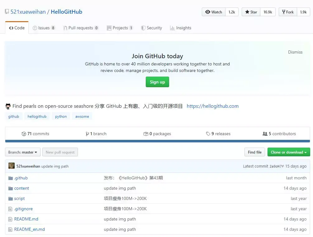 后来自己花了一个星期看完了 Python 的基础知识,就想着找点项目看一看,学一学,练一练,这个时候我才真正的去了解 GitHub,开始了在 GitHub 的瞎逛之旅,在开始之初,随之而来的问题是我不知道哪些项目当时还是新手的我,哪些项目是好项目,哪些项目好玩有价值。