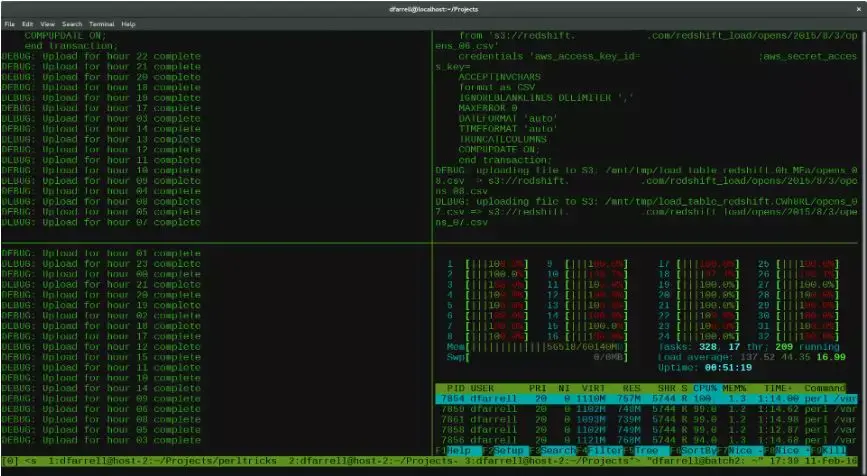 tmux:一个终端复用工具,可极大的提高工作效率。 提供了强劲的、易于使用的命令行界面; 可横向和纵向分割窗口; 窗格可以自由移动和调整大小,或直接利用四个预设布局之一; 可在多个缓冲区进行复制和粘贴; 可通过交互式菜单来选择窗口、会话及客户端; 等等。