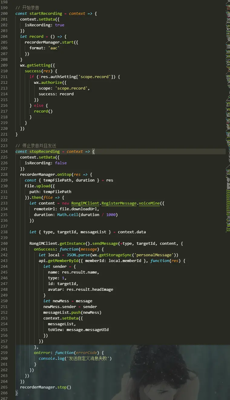 小程序发送语音需要使用自定义发送,我在service中穿件一个自定义发送语音消息,自定义消息最好是在init之前connect之后,