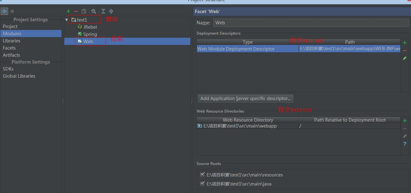 一般我们项目只是单独的一个,所以只需要配置一个模块,我们可以给模块添加框架