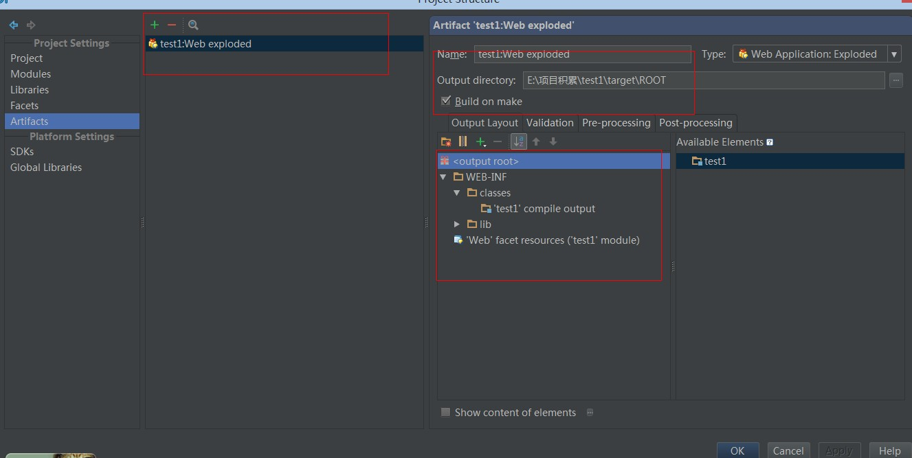 exploded:在这里你可以理解为展开,不压缩的意思。也就是war、jar等产出物没压缩前的目录结构。建议在开发的时候使用这种模式,便于修改了文件的效果立刻显现出来。 ) 默认情况下,IDEA的 Modules 和 Artifacts 的 output目录已经设置好了,不需要更改,打成war包的时候会自动在 WEB-INF目录下生成classes,然后把编译后的文件放进去。