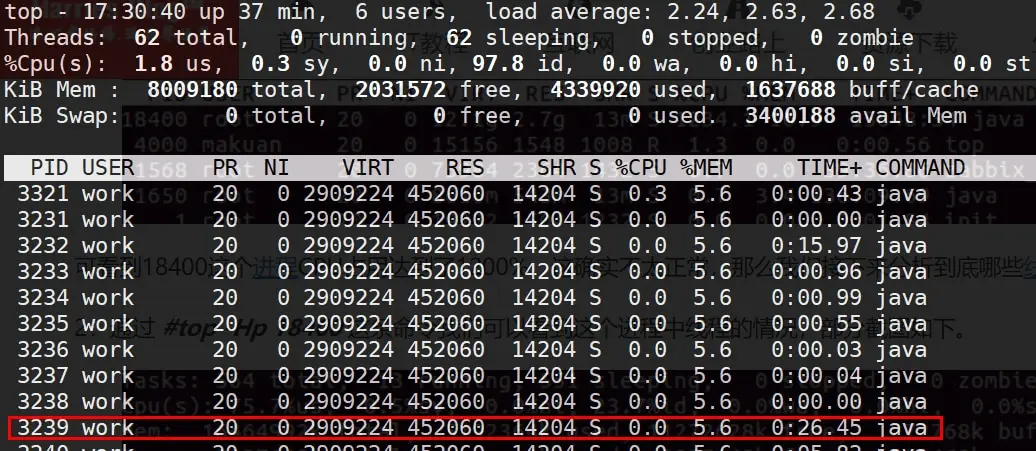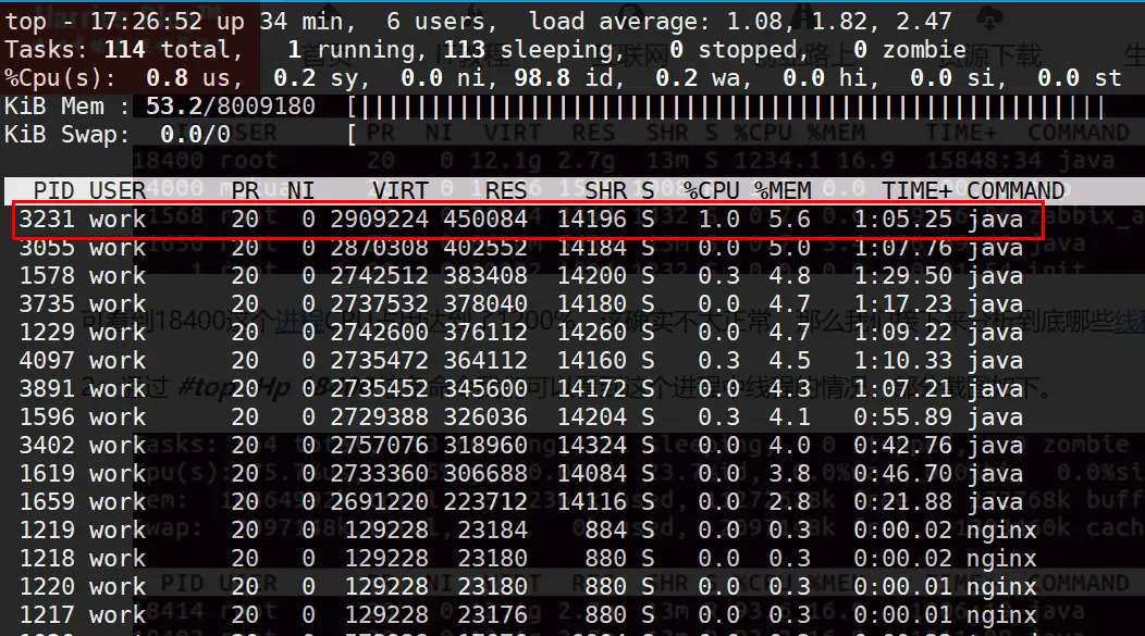 top -Hp pid查看线程的详细情况,例如上面3231进程$ top -Hp 3231我们就分析红线标注的线程