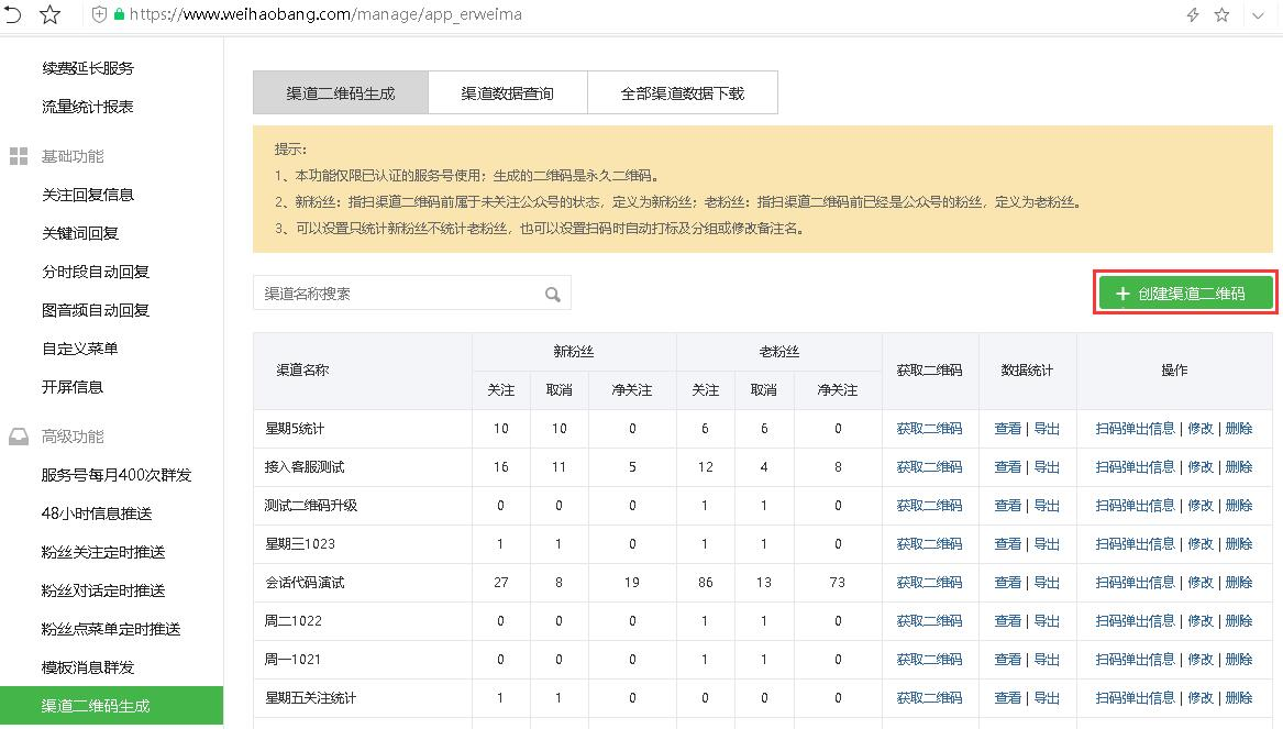 在微号帮平台在注册用户名,登录授权公众号,选择渠道二维码生成功能,创建带参数的二维码。