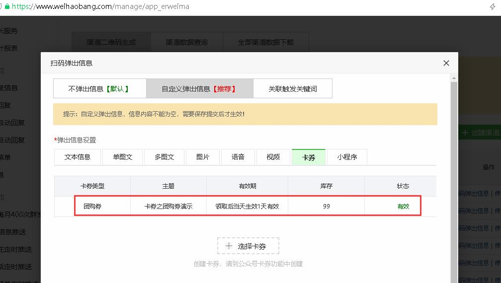微号帮平台带参数的二维码支持不同回复消息,每个二维码代表一个渠道,每个二维码的回复消息都不一样。消息类型支持文本信息、图文消息、卡券、小程序、图片、音频、视频。