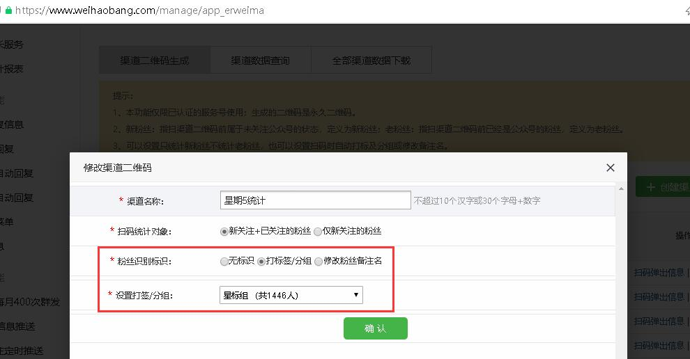 带参数的二维码生成后,支持修改粉丝打标签分组或备注名,也可以修改标签分组。