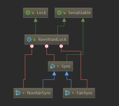 可以看到,ReentrantLock内有三个内部类。 分别是Sync、NonfairSync、FairSyn,其中NonfairSync、FairSyn继承自Sync,Sync类继承自AbstractQueuedSynchronizer抽象类。