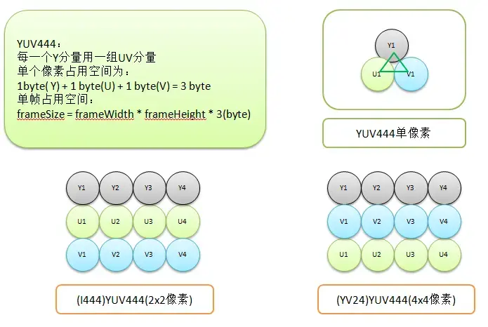 首先要介绍的是YUV444,这种格式占用空间最大,每个像素点有一个Y分量+一个U分量+一个V分量所以和rgb一样每个像素点占用3个字节!