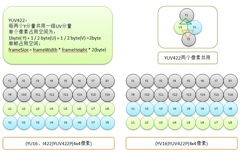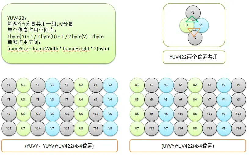 接下来是YUV422 每两个Y分量公用一个UV分量,所以一个像素占用两个字节,根据存储顺序不同又分为四种不同的格式。